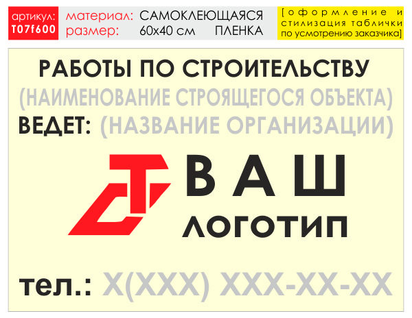 Баннер «Работы по строительству», T07 (самокл. плёнка, 60х40 см)