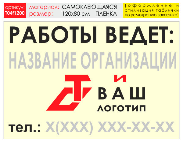 Баннер «Работы ведет», T04 (самоклеящаяся плёнка, 120х90 см) в Сургуте купить