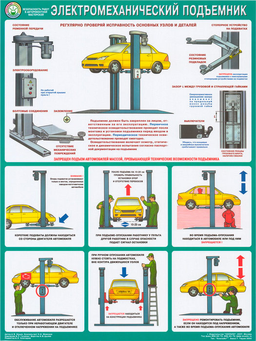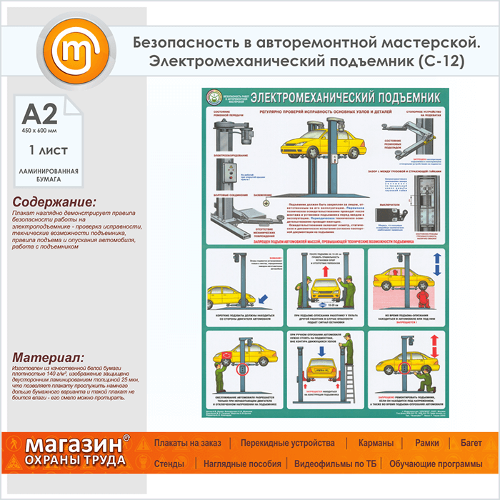 Плакат «Безопасность в авторемонтной мастерской. Электромеханический подъемник» (С-12, ламинированная бумага, А2, 1 лист) в Сургуте купить