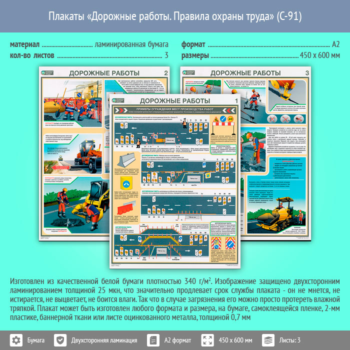 Плакаты «Дорожные работы. Правила охраны труда» (С-91, ламинированная бумага, А2, 3 листа) в Сургуте купить