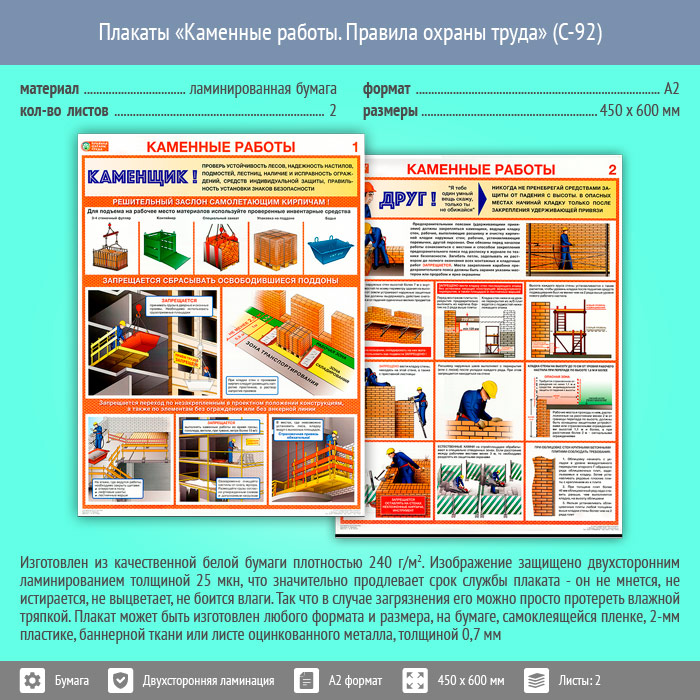 Плакаты «Каменные работы. Правила охраны труда» (С-92, ламинированная бумага, А2, 2 листа) в Сургуте купить