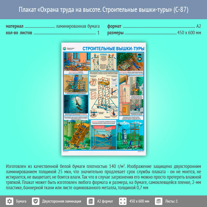 Плакат «Охрана труда на высоте. Строительные вышки-туры» (С-87, ламинированная бумага, А2, 1 лист) в Сургуте купить