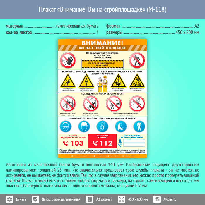 Плакат «Внимание! Вы на стройплощадке» (М-118, ламинированная бумага, А2, 1 лист) в Сургуте купить