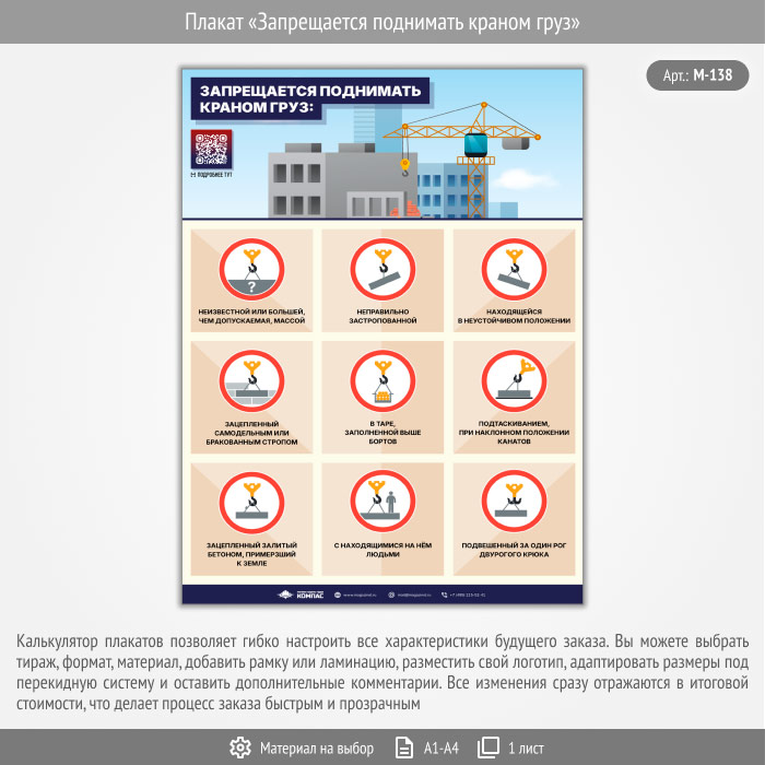 Плакат «Запрещается поднимать краном груз» с QR (М-138, 1 лист) в Сургуте купить