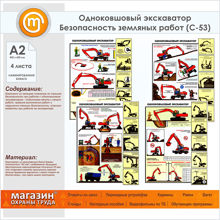 Плакаты «Одноковшовый экскаватор. Безопасность земляных работ» (С-53, ламинированная бумага, А2, 4 листа) в Сургуте купить