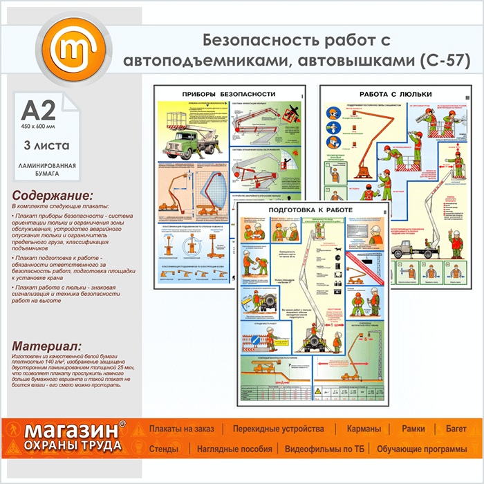 Плакаты «Безопасность работ с автоподъемниками, автовышками» (С-57, ламинированная бумага, А2, 3 листа) в Сургуте купить
