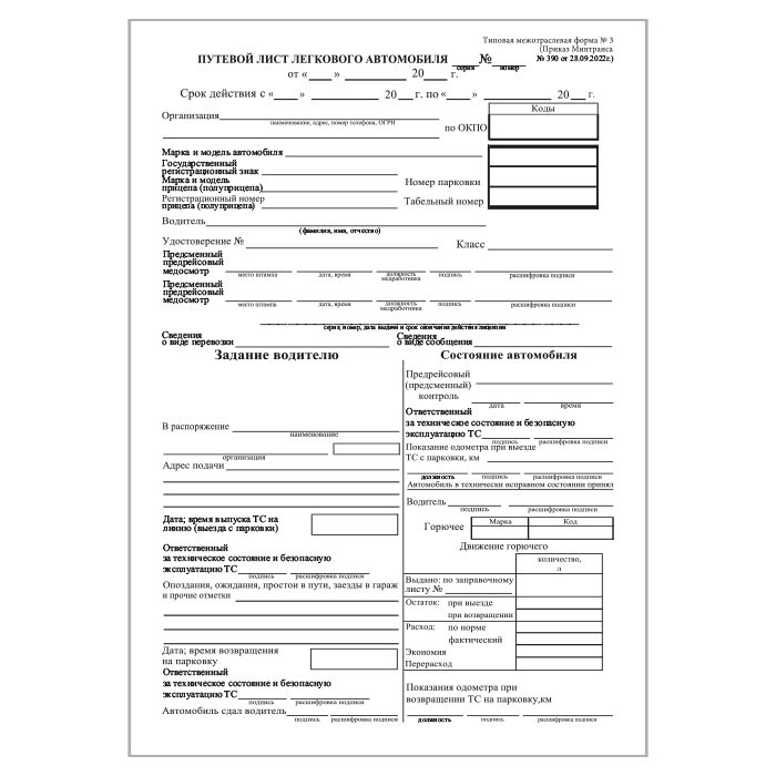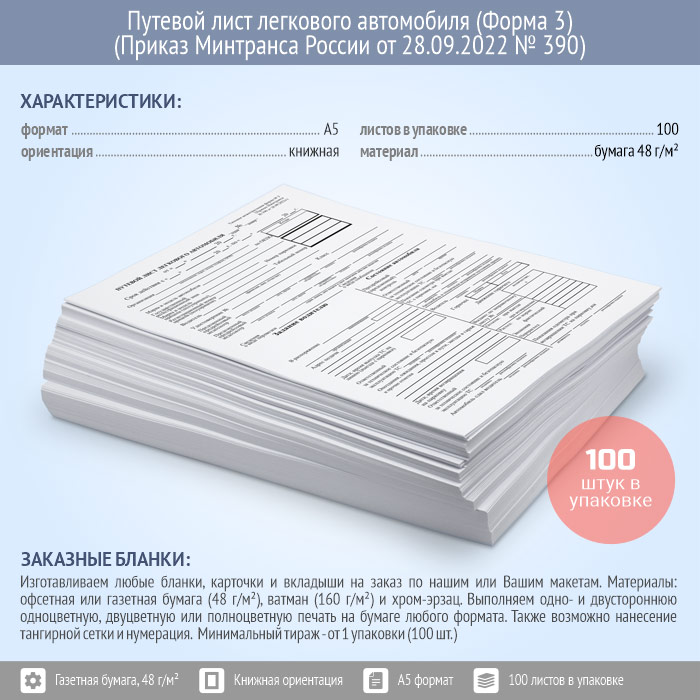 Путевой лист легкового автомобиля (Форма № 3) (Приказ Минтранса России от 28.09.2022 № 390) (упаковка из 100 штук) в Сургуте купить