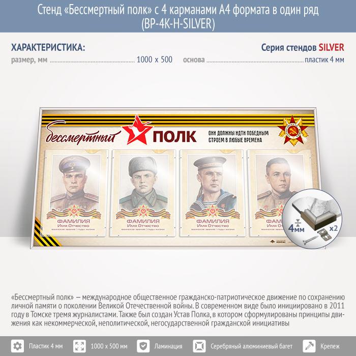 Стенд «Бессмертный полк» с 4 карманами А4 формата в один ряд (BP-4K-H-SILVER) в Сургуте купить