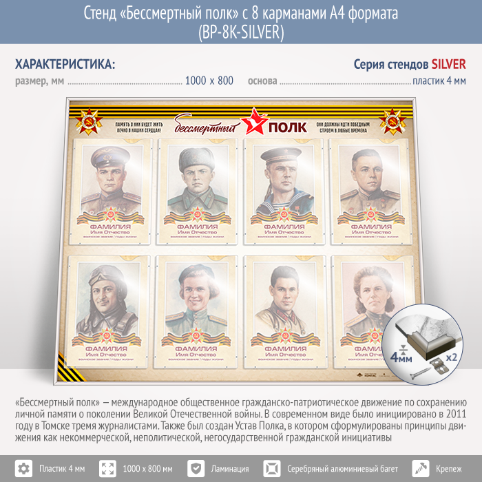 Стенд «Бессмертный полк» с 8 карманами А4 формата (BP-8K-SILVER) в Сургуте купить