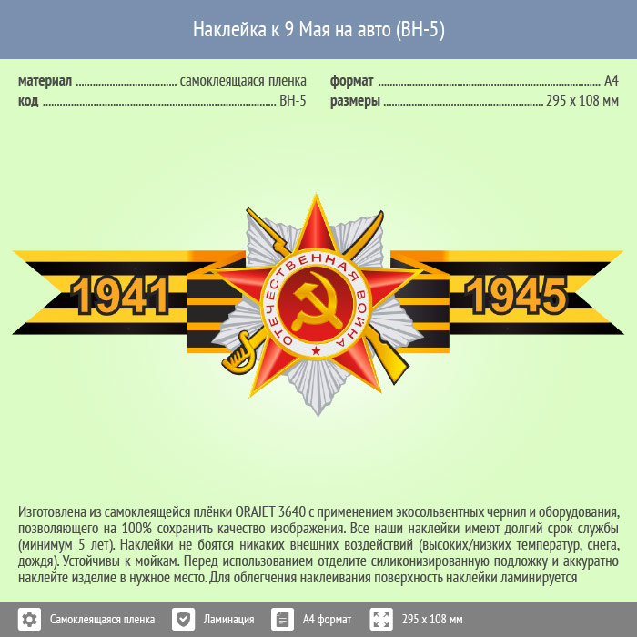 Наклейка к 9 Мая на авто А4 формата (BH-5) в Сургуте купить