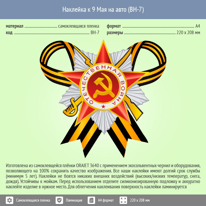 Наклейка к 9 Мая на авто А4 формата (BH-7) в Сургуте купить