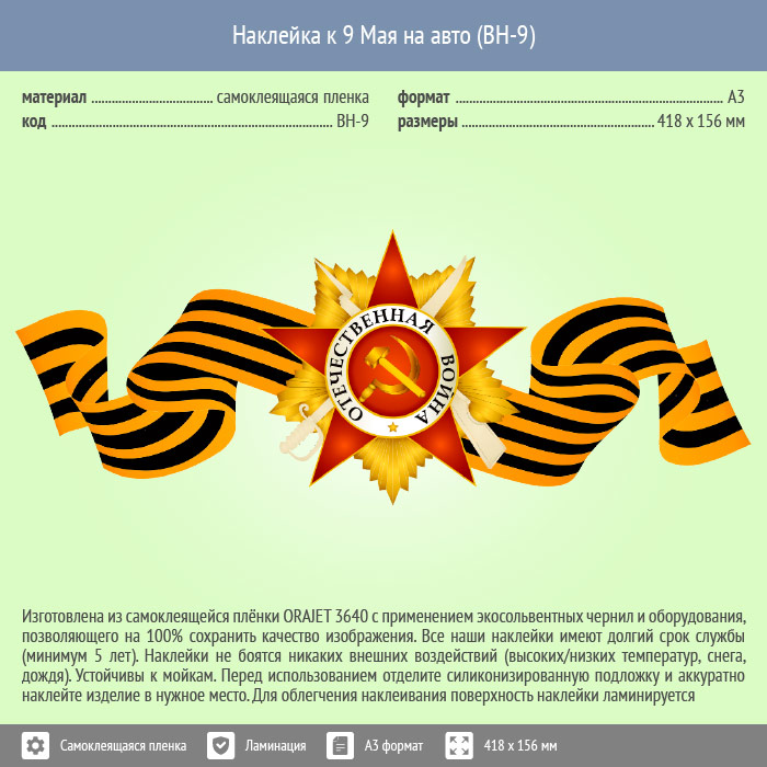 Наклейка к 9 Мая на авто А3 формата (BH-9) в Сургуте купить