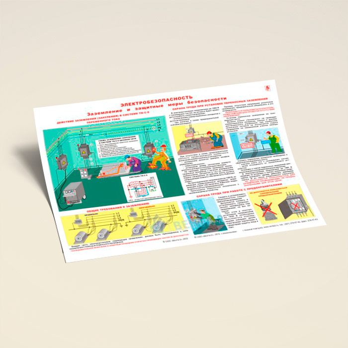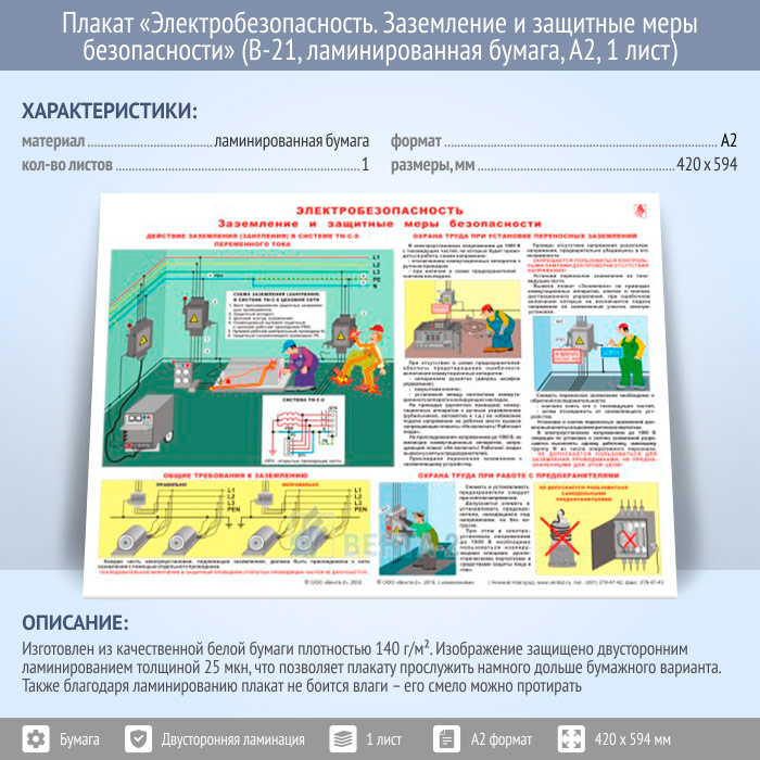 Плакат «Электробезопасность. Заземление и защитные меры безопасности» (В-21, ламинированная бумага, А2, 1 лист) в Сургуте купить