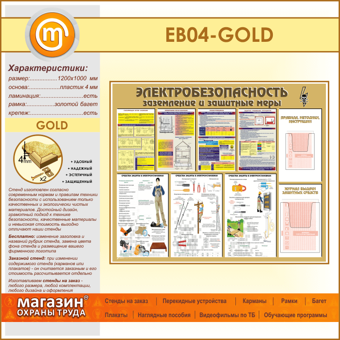 Стенд «Электробезопасность. Заземление и защитные меры» с 2 объемными карманами (EB-04-GOLD) в Сургуте купить