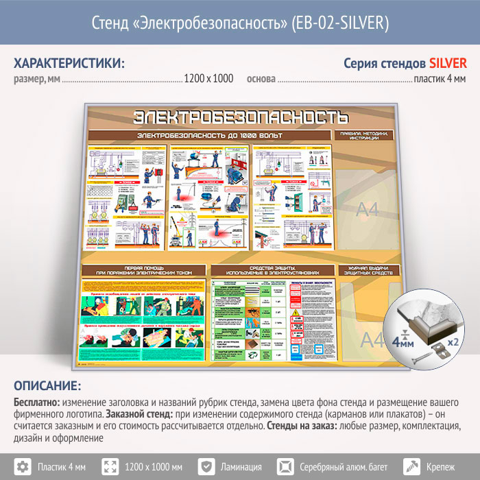 Стенд «Электробезопасность до 1000 вольт» с плоским и объемным карманами (EB-02-SILVER) в Сургуте купить