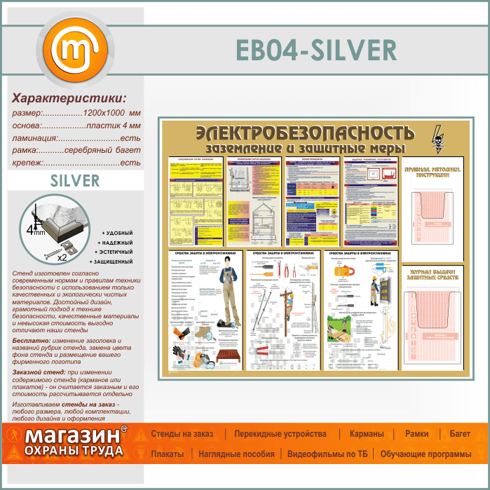 Стенд «Электробезопасность. Заземление и защитные меры» с 2 объемными карманами (EB-04-SILVER) в Сургуте купить