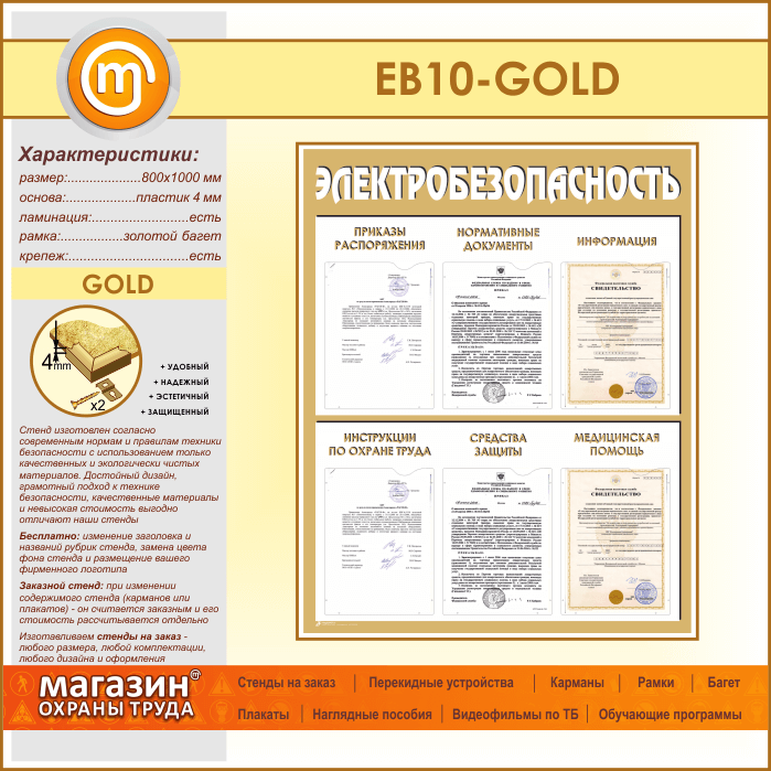 Стенд «Электробезопасность» с 6 карманами (EB-10-GOLD) в Сургуте купить