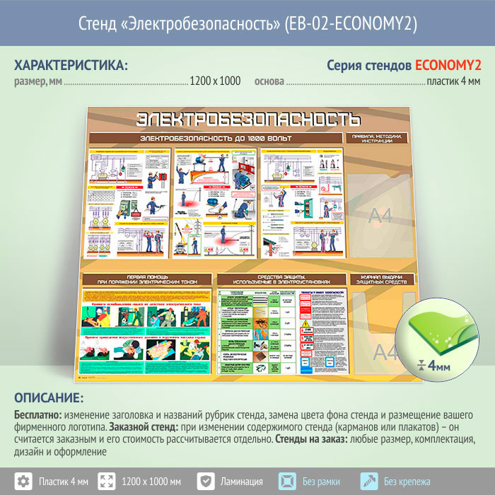 Стенд «Электробезопасность до 1000 вольт» с плоским и объемным карманами (EB-02-ECONOMY2) в Сургуте купить