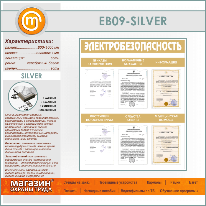 Стенд «Электробезопасность» с 6 карманами (EB-09-SILVER) в Сургуте купить