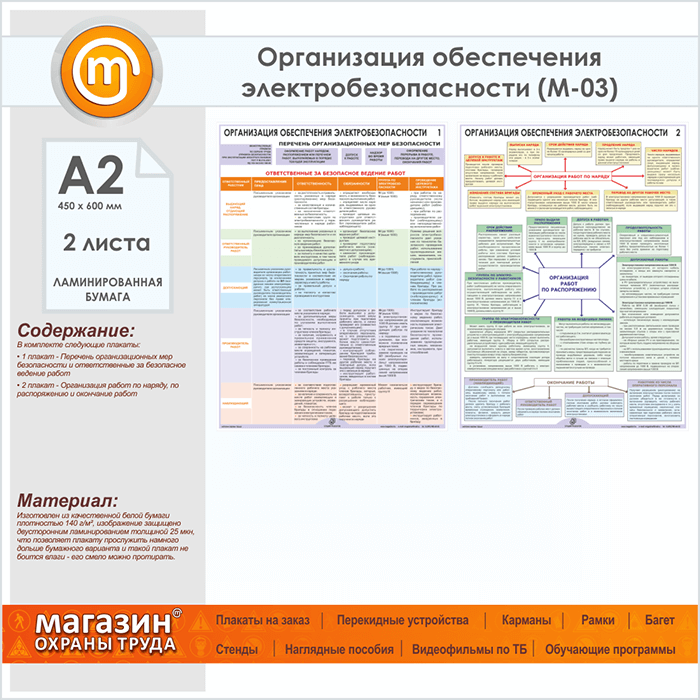 Плакаты «Организация обеспечения электробезопасности» (М-03, ламинированная бумага, А2, 2 листа) в Сургуте купить