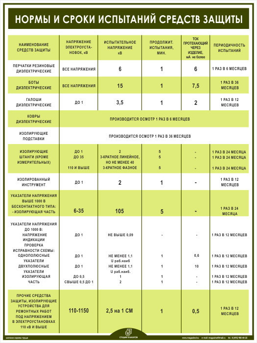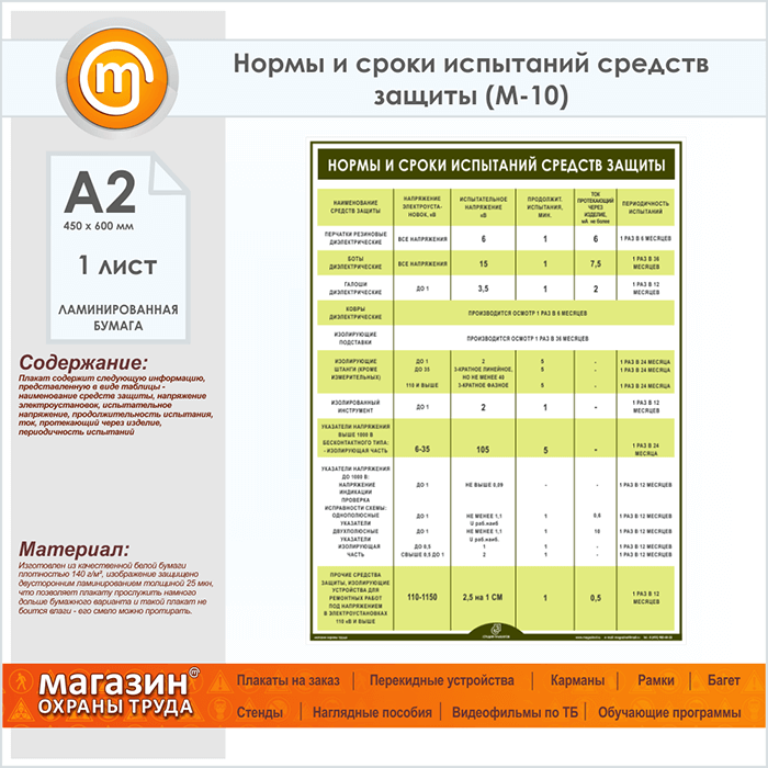Плакат «Нормы и сроки испытаний средств защиты» (М-10, ламинированная бумага, А2, 1 лист) в Сургуте купить