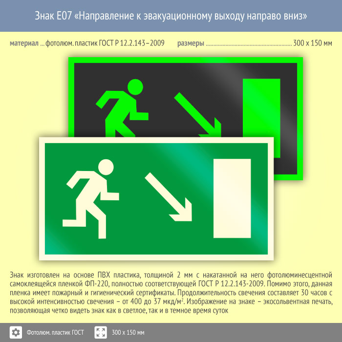 Знак E07 «Направление к эвакуационному выходу направо вниз» (фотолюминесцентный пластик ГОСТ 34428-2018, 300х150 мм) в Сургуте купить