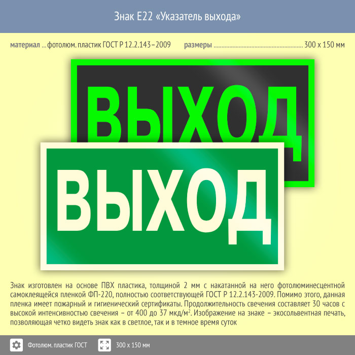 Знак E22 «Указатель выхода» (фотолюминесцентный пластик ГОСТ 34428-2018, 300х150 мм) в Сургуте купить