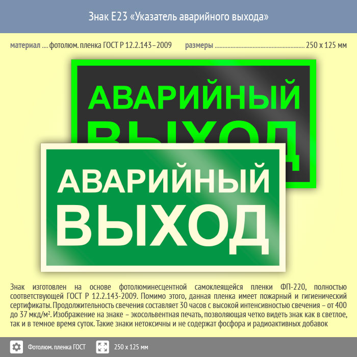 Знак E23 «Указатель аварийного выхода» (фотолюминесцентная пленка ГОСТ 34428-2018, 250х125 мм) в Сургуте купить