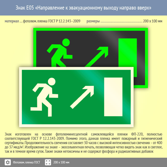 Знак E05 «Направление к эвакуационному выходу направо вверх» (фотолюминесцентная пленка ГОСТ 34428-2018, 200х100 мм) в Сургуте купить