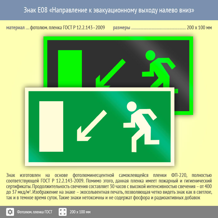 Знак E08 «Направление к эвакуационному выходу налево вниз» (фотолюминесцентная пленка ГОСТ 34428-2018, 200х100 мм) в Сургуте купить
