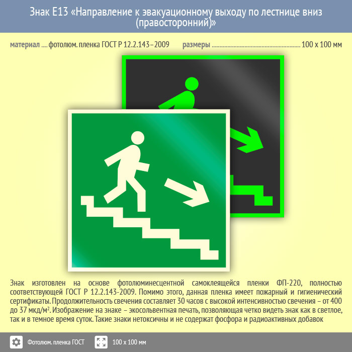 Знак E13 «Направление к эвакуационному выходу по лестнице вниз (правосторонний)» (фотолюминесцентная пленка ГОСТ 34428-2018, 100х100 мм) в Сургуте купить