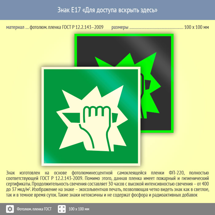 Знак E17 «Для доступа вскрыть здесь» (фотолюминесцентная пленка ГОСТ 34428-2018, 100х100 мм) в Сургуте купить