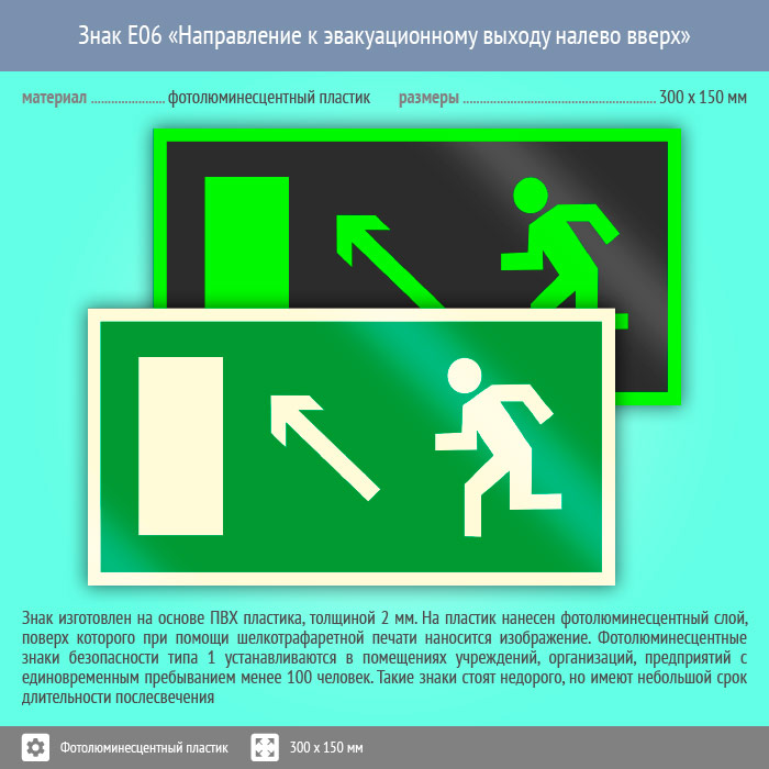 Знак E06 «Направление к эвакуационному выходу налево вверх» (фотолюминесцентный пластик, 300х150 мм) в Сургуте купить