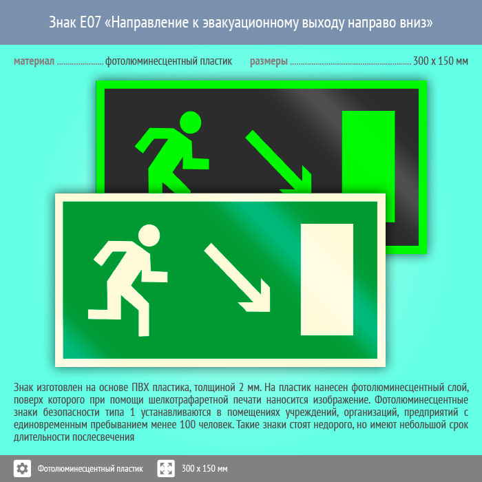 Знак E07 «Направление к эвакуационному выходу направо вниз» (фотолюминесцентный пластик, 300х150 мм) в Сургуте купить