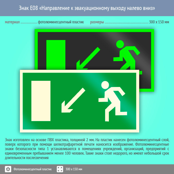 Знак E08 «Направление к эвакуационному выходу налево вниз» (фотолюминесцентный пластик, 300х150 мм) в Сургуте купить