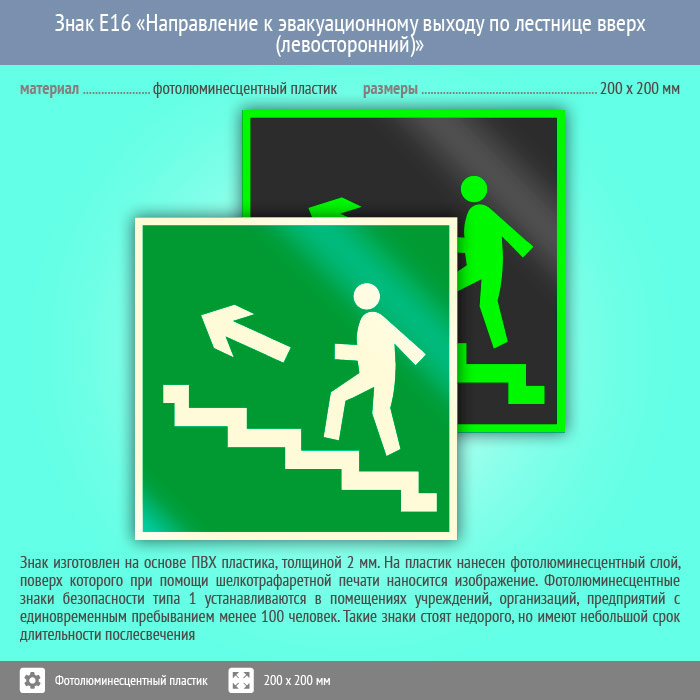 Знак E16 «Направление к эвакуационному выходу по лестнице вверх (левосторонний)» (фотолюминесцентный пластик, 200х200 мм) в Сургуте купить