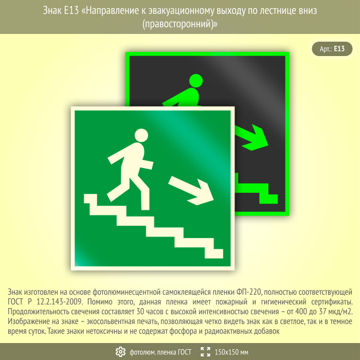 Знак E13 «Направление к эвакуационному выходу по лестнице вниз (правосторонний)» (фотолюминесцентная пленка ГОСТ 34428-2018, 150х150 мм) в Сургуте купить
