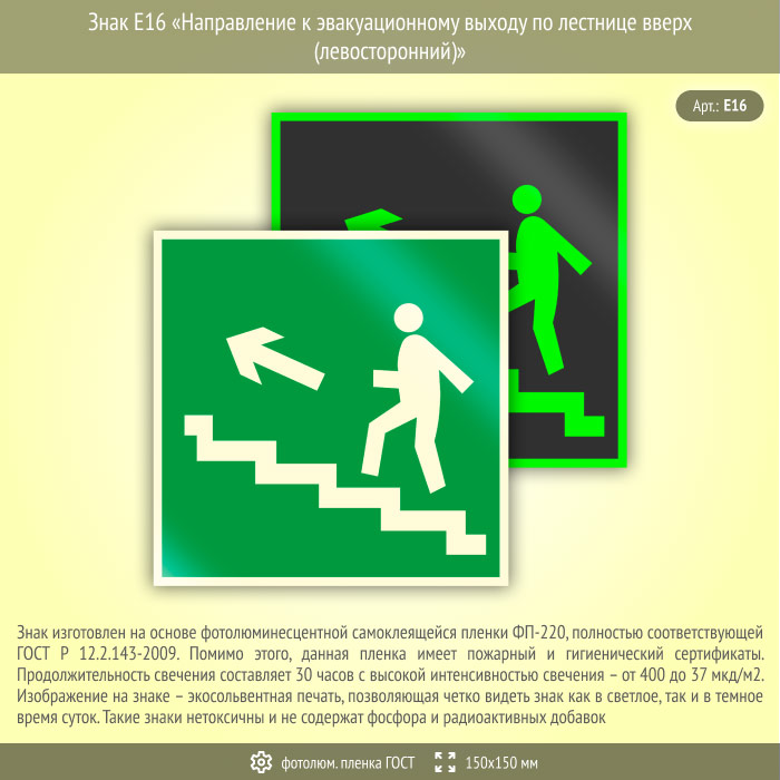 Знак E16 «Направление к эвакуационному выходу по лестнице вверх (левосторонний)» (фотолюминесцентная пленка ГОСТ 34428-2018, 150х150 мм) в Сургуте купить