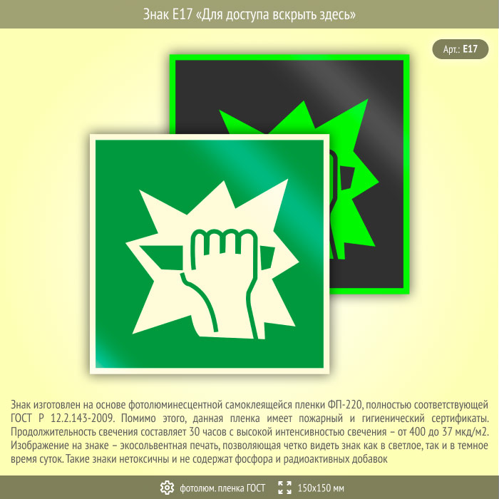 Знак E17 «Для доступа вскрыть здесь» (фотолюминесцентная пленка ГОСТ 34428-2018, 150х150 мм) в Сургуте купить