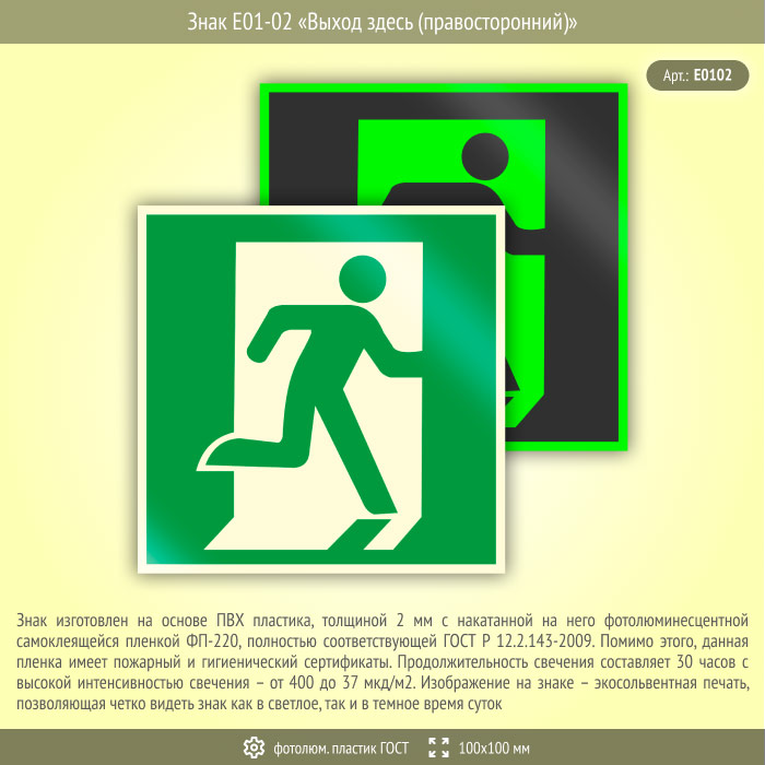 Знак E01-02 «Выход здесь (правосторонний)» (фотолюминесцентный пластик ГОСТ 34428-2018, 100х100 мм) в Сургуте купить
