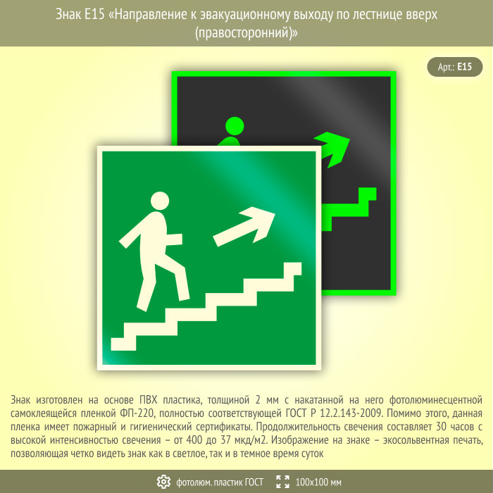 Знак E15 «Направление к эвакуационному выходу по лестнице вверх (правосторонний)» (фотолюминесцентный пластик ГОСТ 34428-2018, 100х100 мм) в Сургуте купить