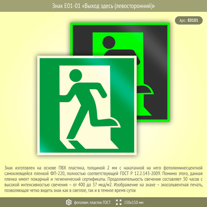 Знак E01-01 «Выход здесь (левосторонний)» (фотолюминесцентный пластик ГОСТ 34428-2018, 150х150 мм) в Сургуте купить