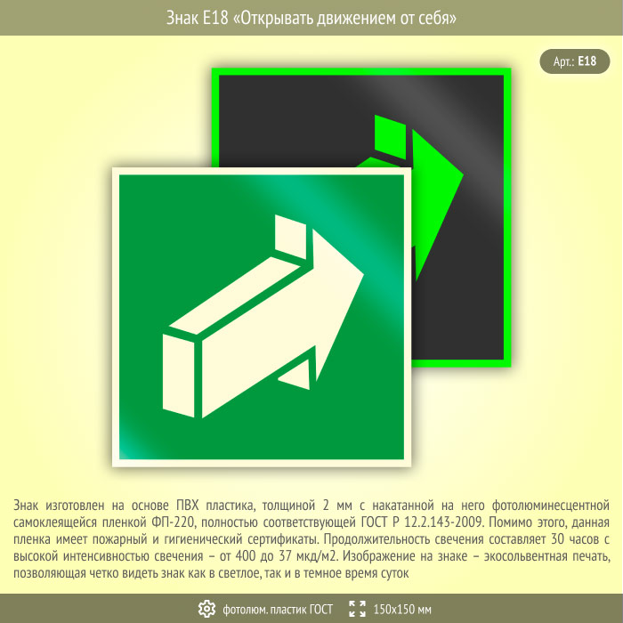 Знак E18 «Открывать движением от себя» (фотолюминесцентный пластик ГОСТ 34428-2018, 150х150 мм) в Сургуте купить