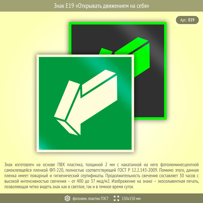 Знак E19 «Открывать движением на себя» (фотолюминесцентный пластик ГОСТ 34428-2018, 150х150 мм) в Сургуте купить