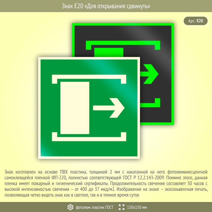 Знак E20 «Для открывания сдвинуть» (фотолюминесцентный пластик ГОСТ 34428-2018, 150х150 мм) в Сургуте купить