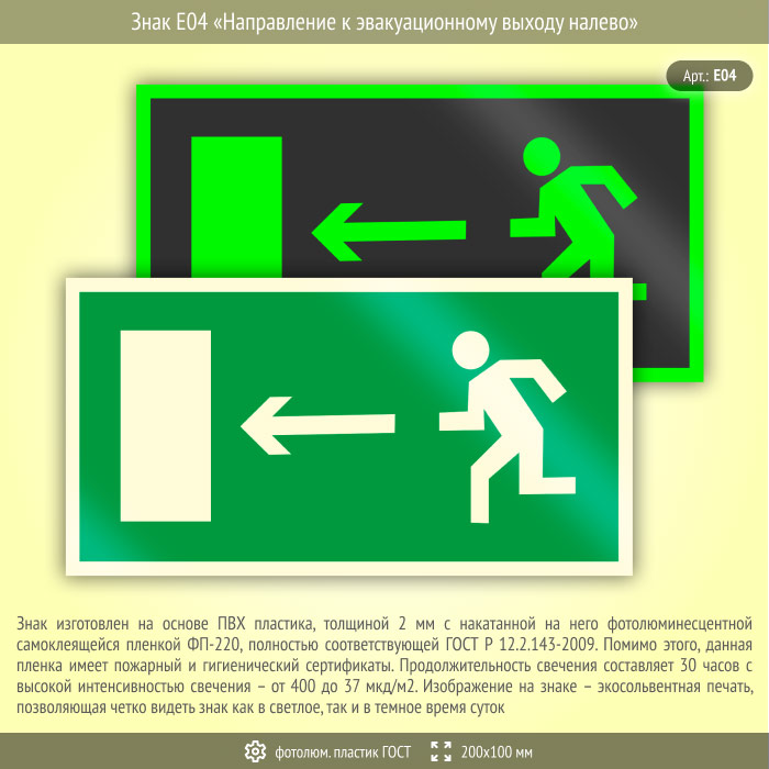 Знак E04 «Направление к эвакуационному выходу налево» (фотолюминесцентный пластик ГОСТ 34428-2018, 200х100 мм) в Сургуте купить