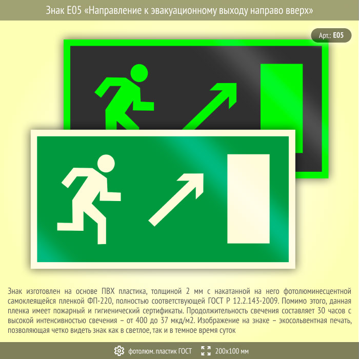 Знак E05 «Направление к эвакуационному выходу направо вверх» (фотолюминесцентный пластик ГОСТ 34428-2018, 200х100 мм) в Сургуте купить