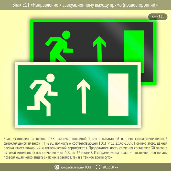 Знак E11 «Направление к эвакуационному выходу прямо (правосторонний)» (фотолюминесцентный пластик ГОСТ 34428-2018, 200х100 мм) в Сургуте купить