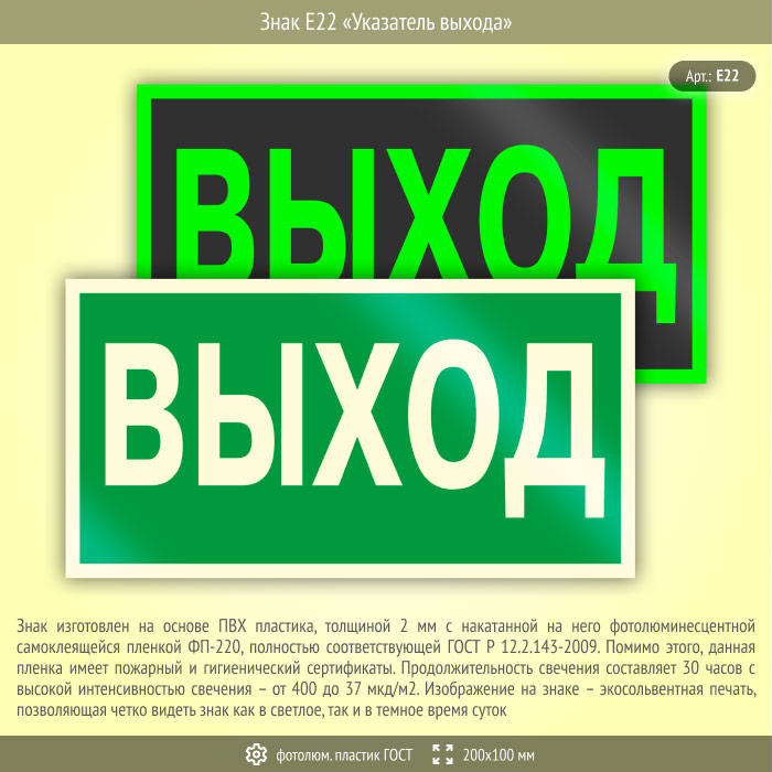 Знак E22 «Указатель выхода» (фотолюминесцентный пластик ГОСТ 34428-2018, 200х100 мм) в Сургуте купить