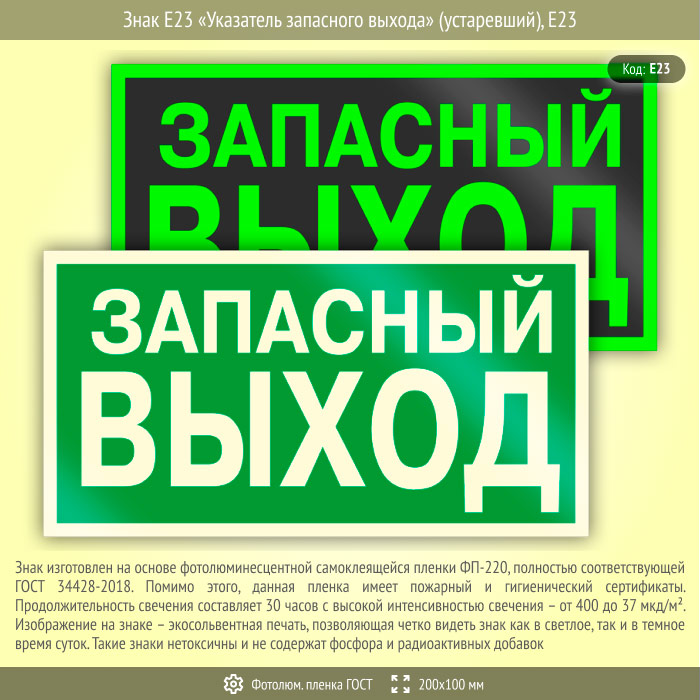 Знак E23 «Указатель запасного выхода» (устаревший) (фотолюминесцентная пленка ГОСТ 34428-2018, 200х100 мм) в Сургуте купить